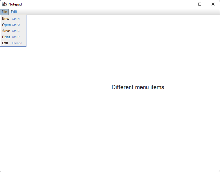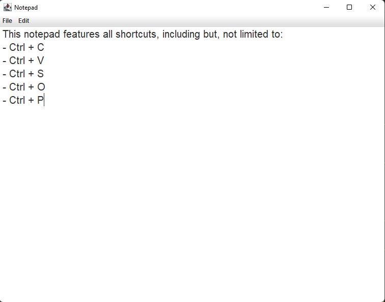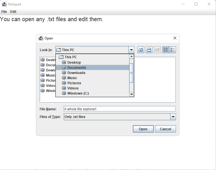This is a simple notepad program that I have made. It shows knowledge of FileReader's, FileChooser's, and JMenuItem's. Hope you like it!